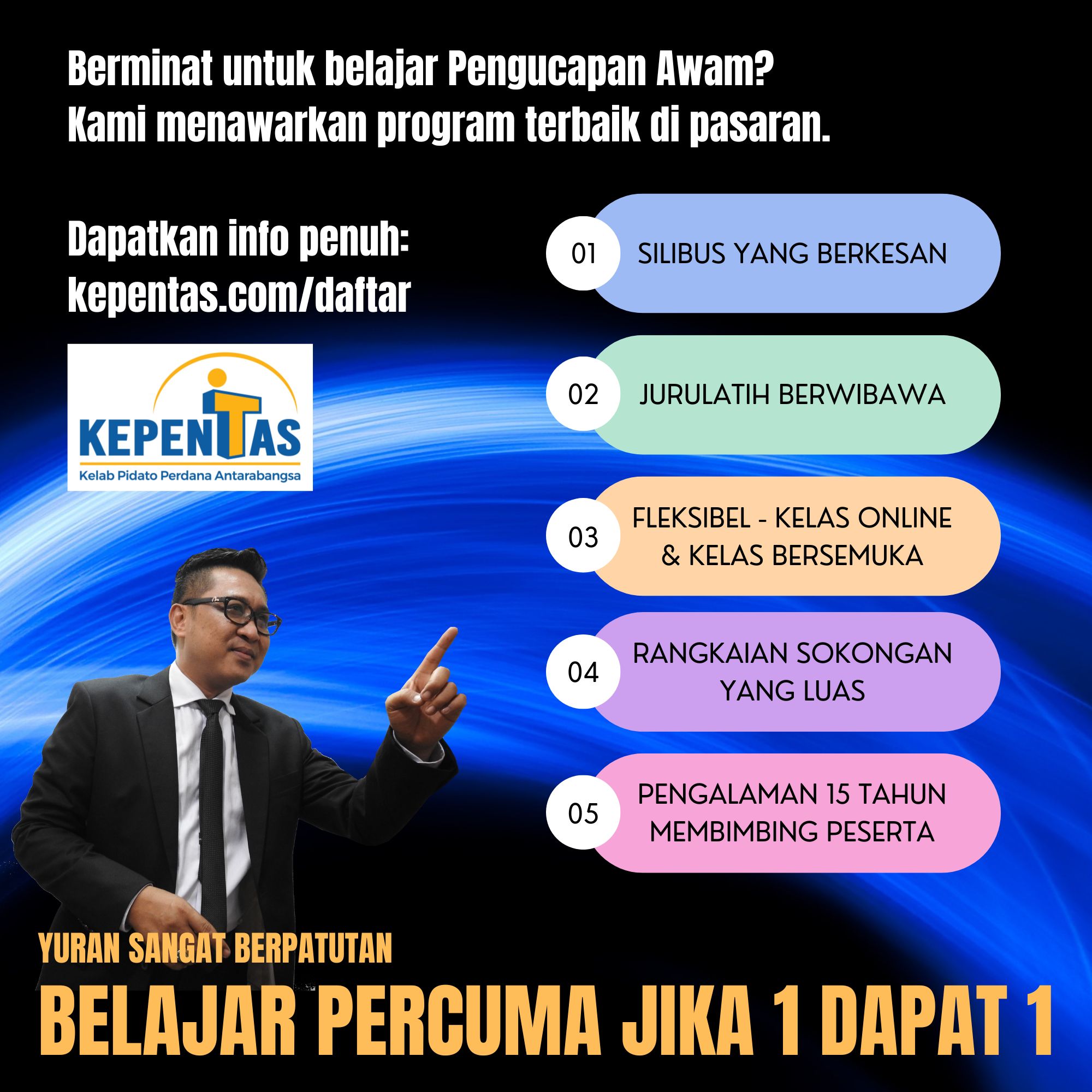 Kami menawarkan wadah pelatihan berterusan melalui Kelas Pengucapan Awam yang diadakan secara dalam talian dan bersemuka.