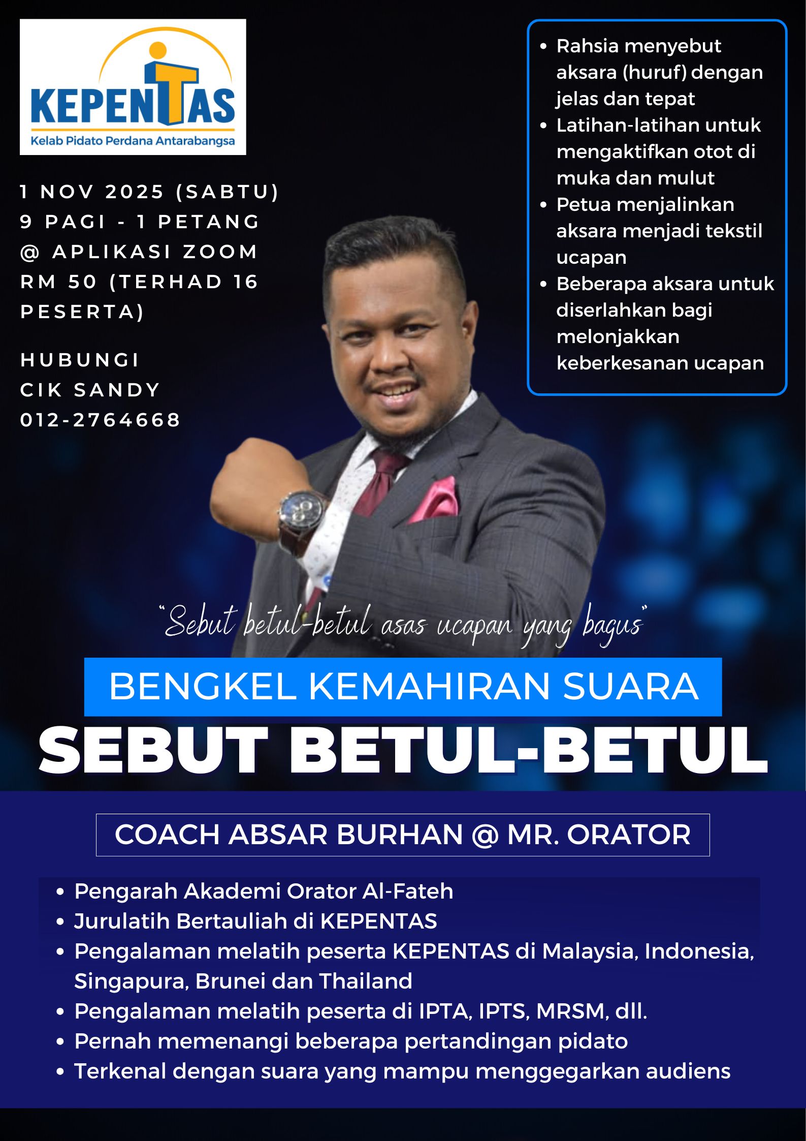 Ahli KEPENTAS berpeluang untuk menyertai pertandingan-pertandingan pidato yang dianjurkan oleh KEPENTAS.
