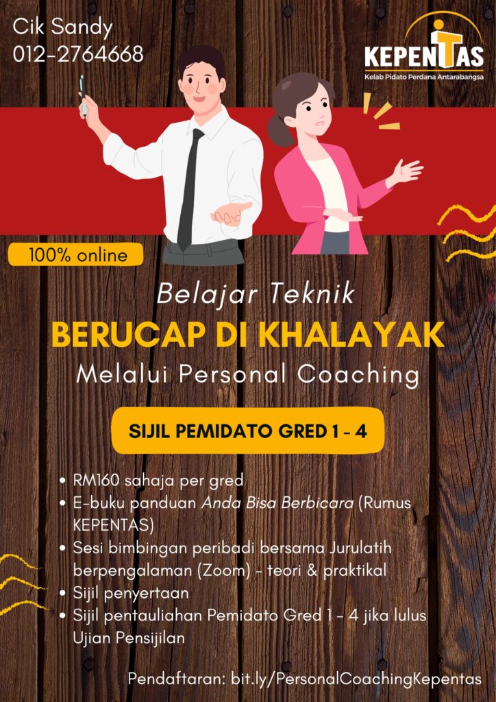 Sila hubungi Cik Sandy 012-2764668 untuk pendaftaran. Atau daftar melalui borang bit.ly/PersonalCoachingKepentas.