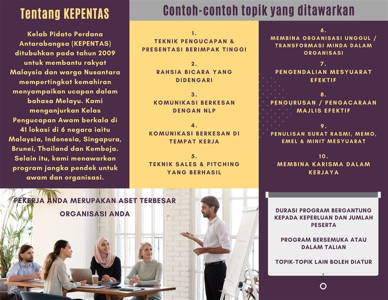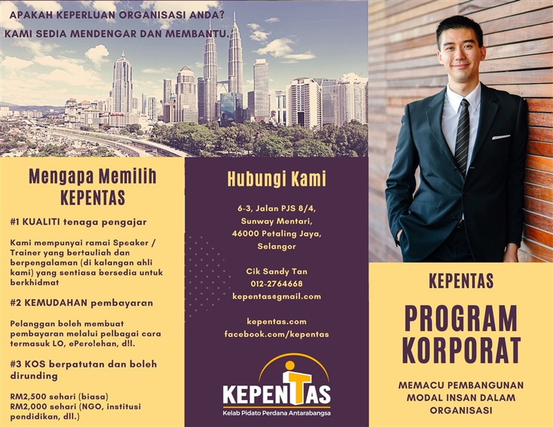 Kami menawarkan program untuk organisasi secara bersemuka dan dalam talian. Sila hubungi Cik Sandy Tan 012-2764668 untuk mendapatkan ringkasan kursus, profil tenaga pengajar dan sebut harga.